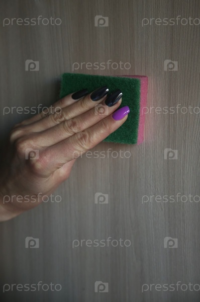 Поролоновая губка для уборки и чистящее средство в женской руке. Уборка квартиры и клининг
