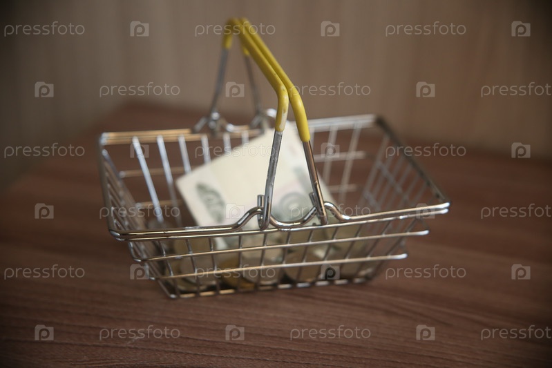 Деньги рубли банкноты и монеты в маленькой металлической корзине для покупок. Финансы и кредит. Покупки и продовольственная сфера. Крупный план