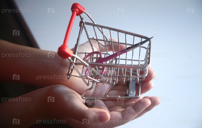 Маленькая тележка для продуктов с ножницами внутри в детской руке над столом. Крупный план