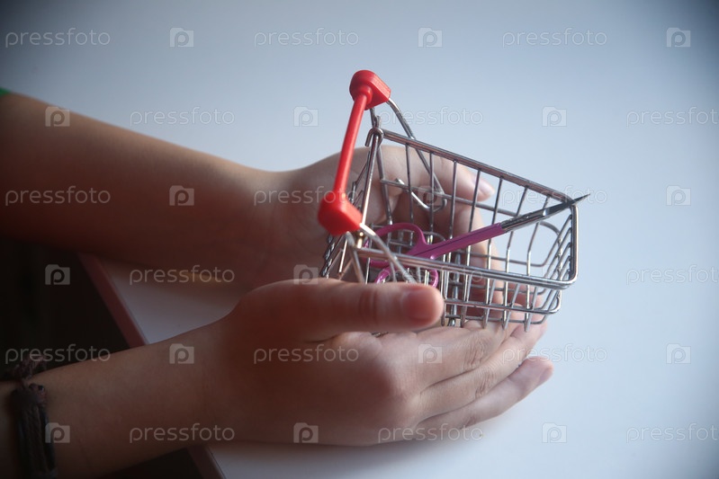 Покупки в магазине. Маленькая тележка для продуктов с ножницами в ней в детской руке. Крупный план