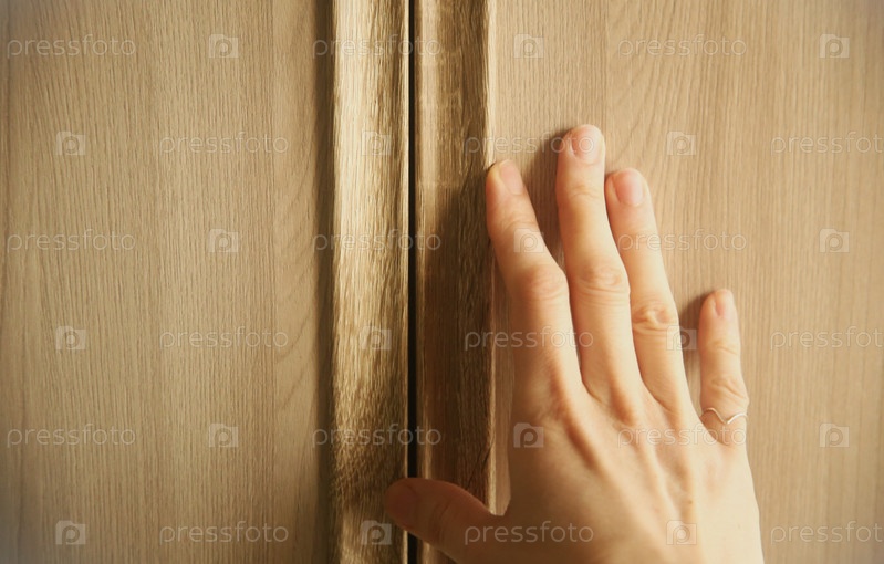 Женская рука лежит сверху дверцы деревянного шкафа. Крупный план. обустройство и уют в квартире