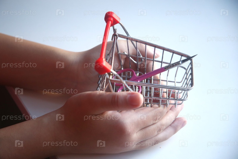 Покупки в магазине. Маленькая тележка для продуктов в детской руке над столом. Крупный план
