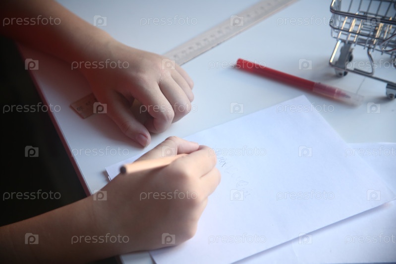Девочка школьница пишет карандашом на бумаге. Школа и образование