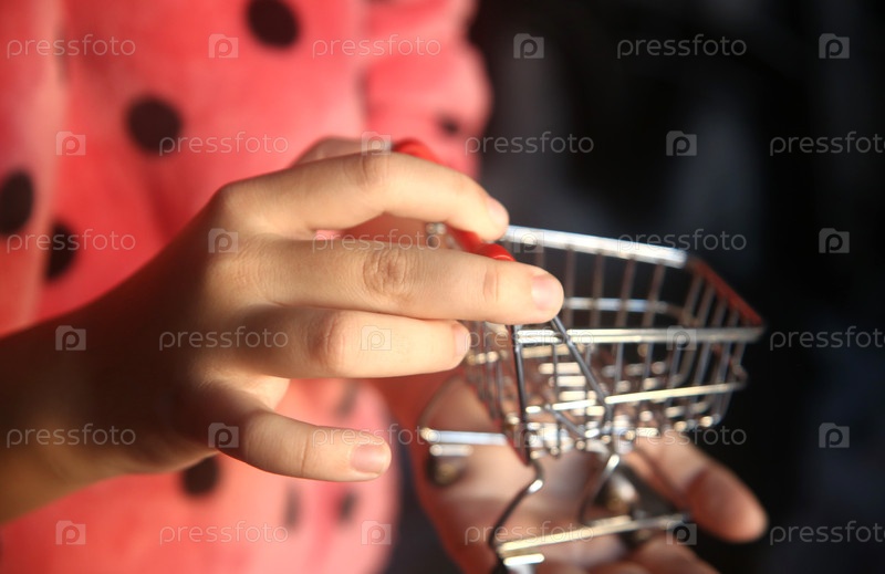 Покупки в магазине. Маленькая тележка для продуктов в детской руке над столом. Крупный план