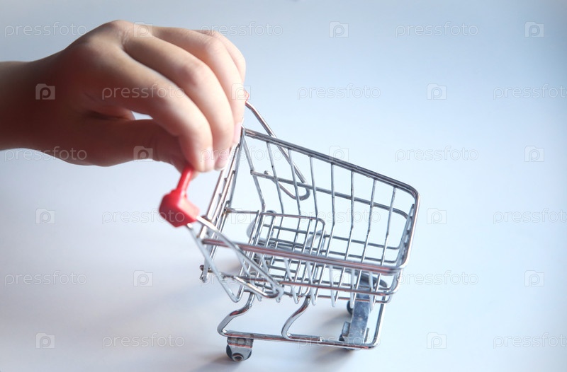 Покупки в магазине. Маленькая тележка для продуктов в детской руке над столом. Крупный план