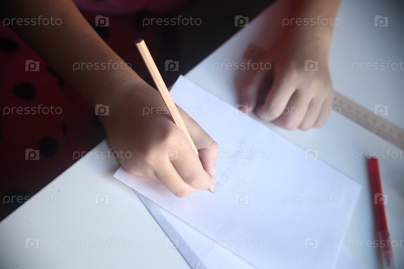 Девочка школьница пишет карандашом на бумаге. Школа и образование