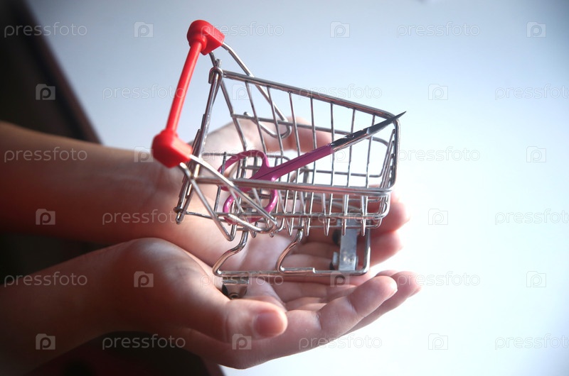 Покупки в магазине. Маленькая тележка для продуктов с ножницами в детской руке над столом. Крупный план
