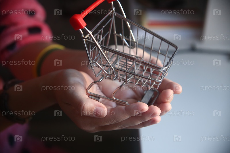 Покупки в магазине. Маленькая тележка для продуктов в детской руке над столом. Крупный план
