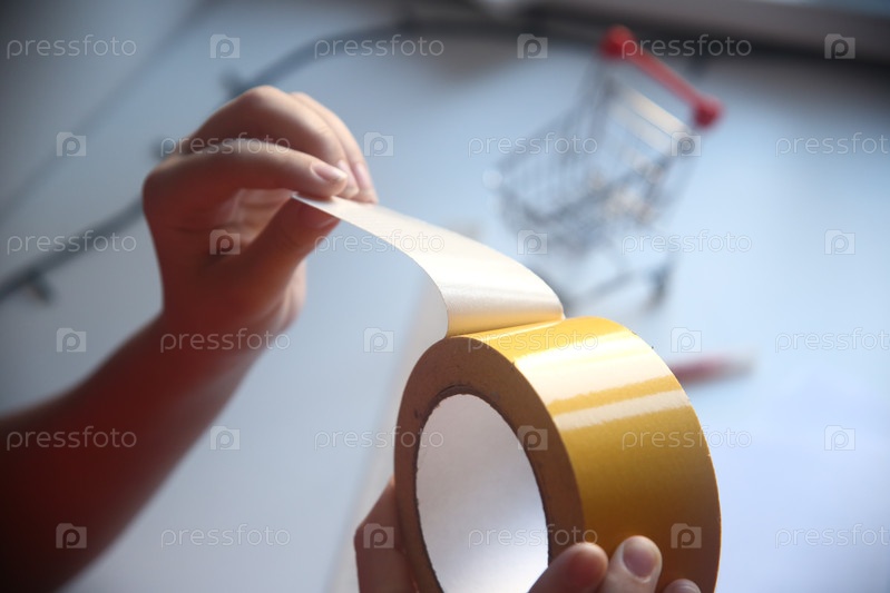 Девочка делает школьную поделку из скотча, разрезая его. Урок труда. Школа и образование