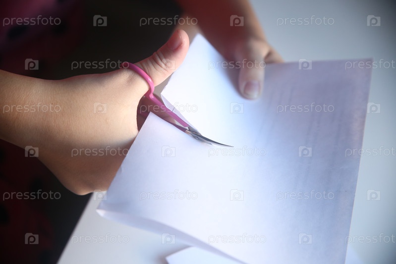Девочка разрезает листы бумаги ножницами. Школьная поделка. Школа и образование