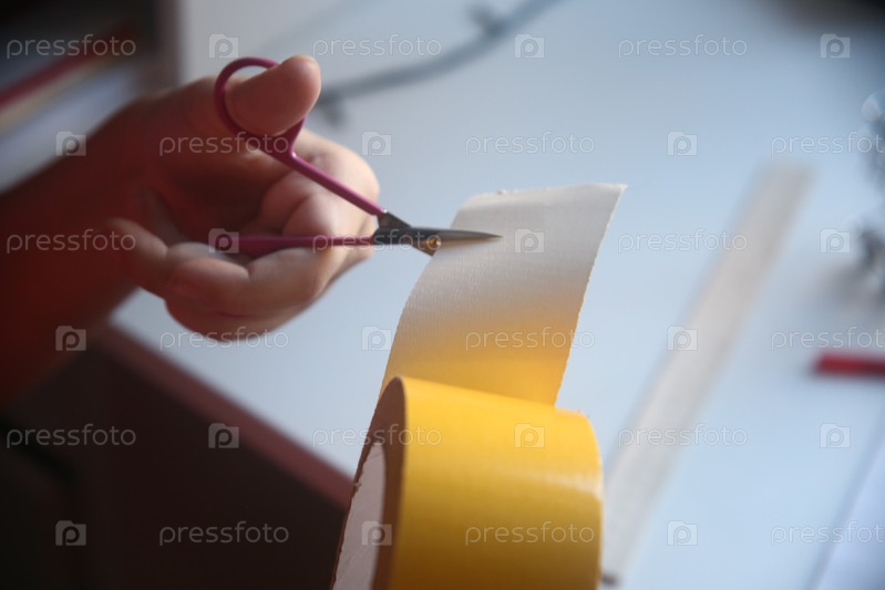 Девочка делает школьную поделку из скотча, разрезая его. Урок труда. Школа и образование