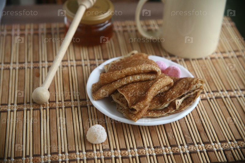 Румяные блины с медом на столе. Праздник масленица