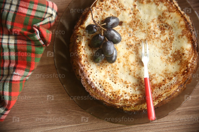 Румяные блины с синим виноградом на тарелке. Праздник масленица