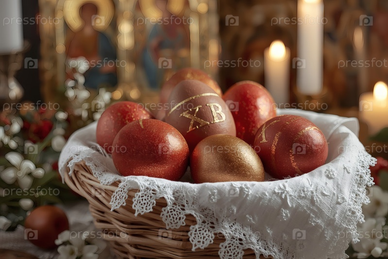 Православный Пасхальный праздник - это пасхальные яйца в корзине из уксуса, иконы, лица святых, цветы, церковные свечи и пасхальное украшение на деревянном столе в старом деревенском доме