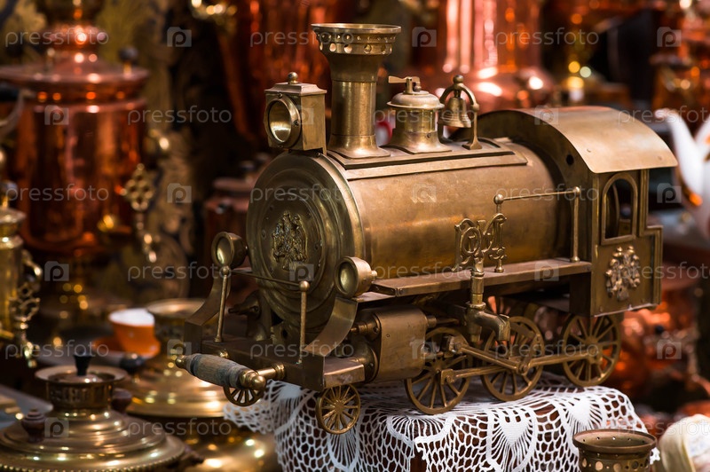 Красивый самовар в виде поезда в музее самоваров Туристический музейный дом и сувенирный магазин Россия, город Коломна