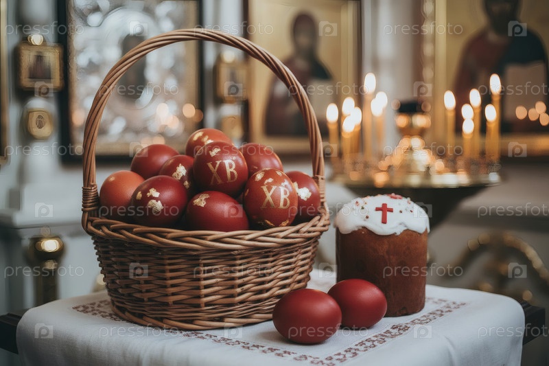 Православная Пасха: пасхальные яйца и пасхальный торт в корзине из плесеня, иконы, лица святых, цветы, церковные свечи и праздничный декор на столе внутри церкви