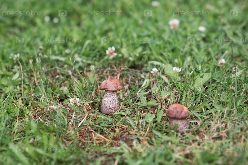 Близкий снимок гриба Léccinum scábrum на лесной равнине
