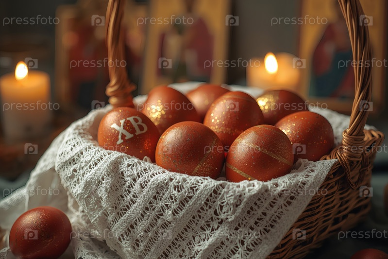 Православный Пасхальный праздник - это пасхальные яйца в корзине из уксуса, иконы, лица святых, цветы, церковные свечи и пасхальное украшение на деревянном столе в старом деревенском доме