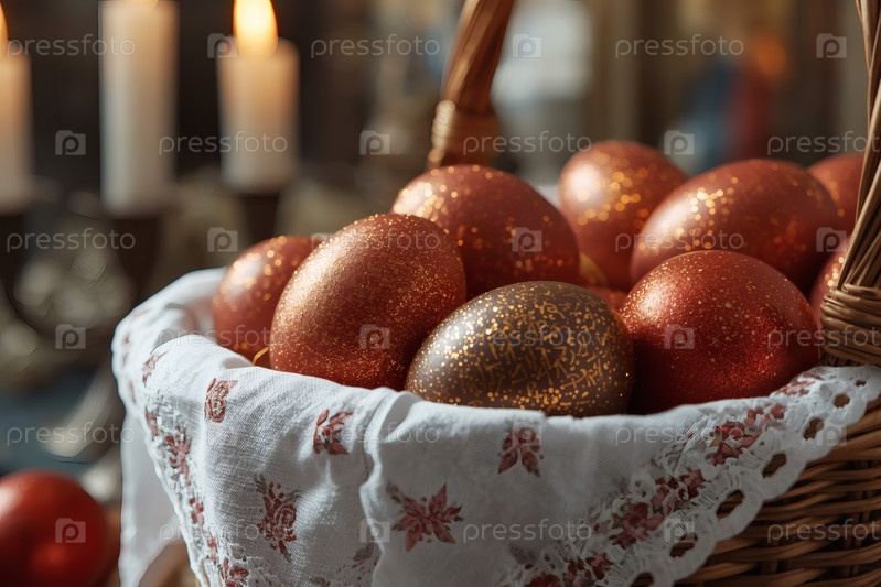 Православный Пасхальный праздник - это пасхальные яйца в корзине из уксуса, иконы, лица святых, цветы, церковные свечи и пасхальное украшение на деревянном столе в старом деревенском доме
