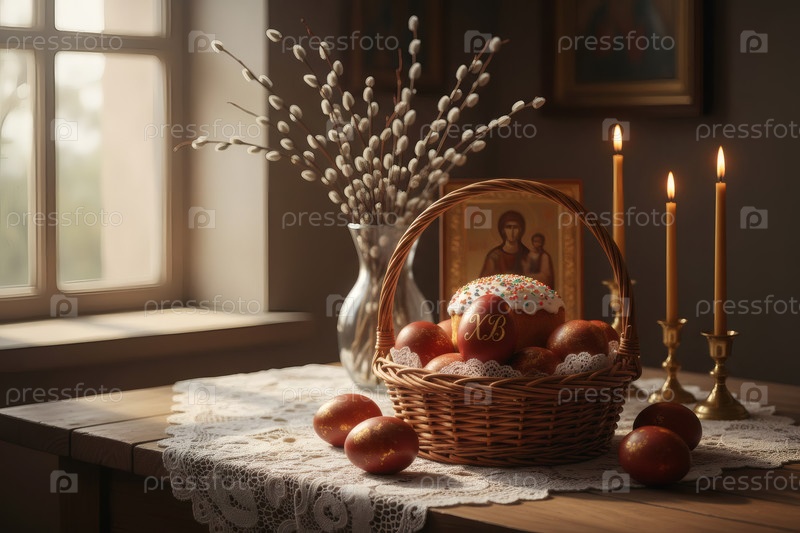 Православная Пасха: пасхальные яйца и пасхальный торт в корзине из винта, иконы, лица святых, верба, церковные свечи и праздничный декор на деревянном столе в старом деревенском доме