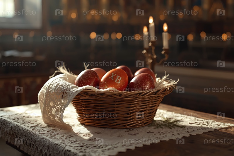 Православный Пасхальный праздник - это пасхальные яйца в корзине из уксуса, иконы, лица святых, цветы, церковные свечи и пасхальное украшение на деревянном столе в старом деревенском доме