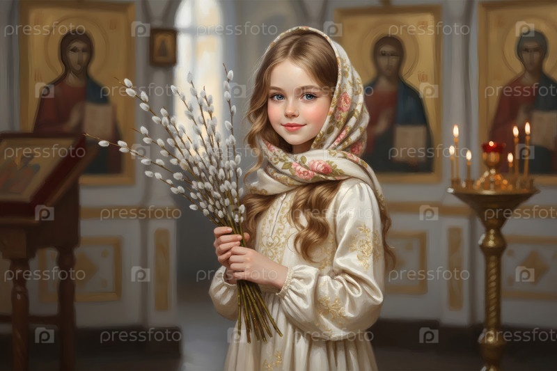 Религия и вера. Пальмовое воскресенье. Портрет маленькой девочки в русском народном плато с букетом верби внутри церкви
