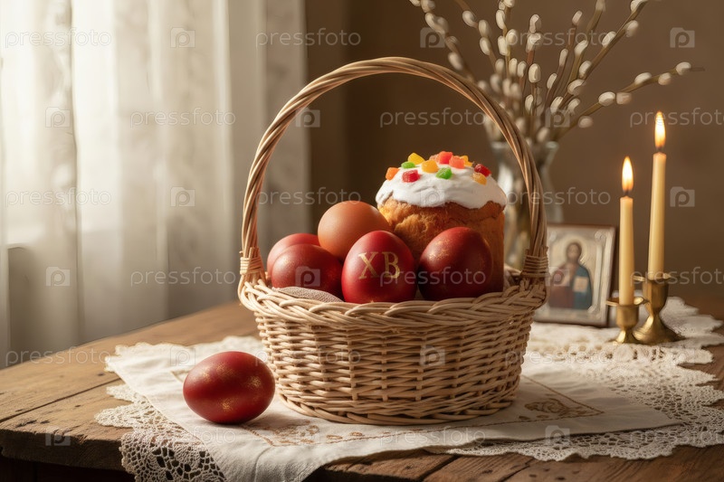 Православная Пасха: пасхальные яйца и пасхальный торт в корзине из винта, иконы, лица святых, верба, церковные свечи и праздничный декор на деревянном столе в старом деревенском доме
