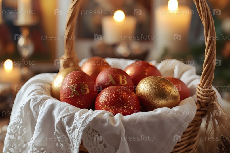 Православный Пасхальный праздник - это пасхальные яйца в корзине из уксуса, иконы, лица святых, цветы, церковные свечи и пасхальное украшение на деревянном столе в старом деревенском доме