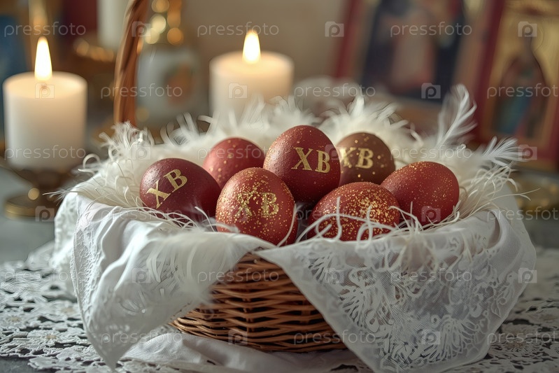 Православный Пасхальный праздник - это пасхальные яйца в корзине из уксуса, иконы, лица святых, цветы, церковные свечи и пасхальное украшение на деревянном столе в старом деревенском доме