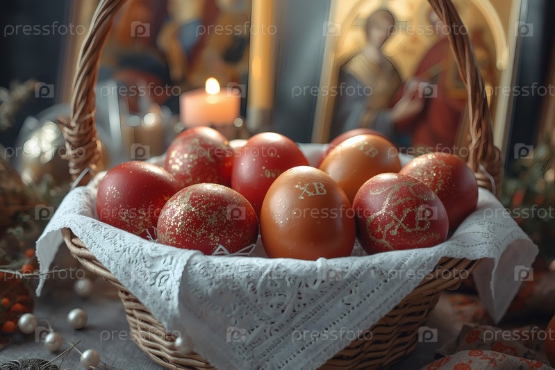 Православный Пасхальный праздник - это пасхальные яйца в корзине из уксуса, иконы, лица святых, цветы, церковные свечи и пасхальное украшение на деревянном столе в старом деревенском доме