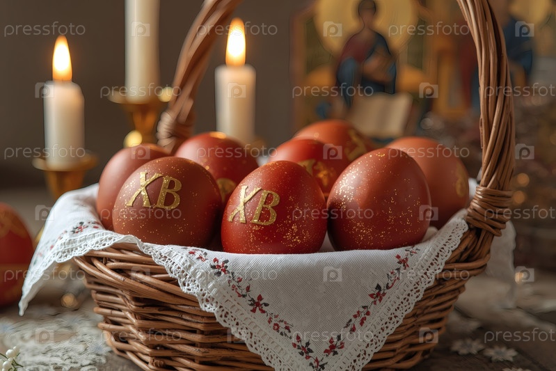 Православный Пасхальный праздник - это пасхальные яйца в корзине из уксуса, иконы, лица святых, цветы, церковные свечи и пасхальное украшение на деревянном столе в старом деревенском доме