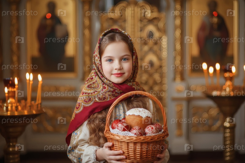 Религия и вера.Счастливого Пасхи.Портрет маленькой девочки в русском народном шарфе с плетеновой корзиной пасхальных яиц и пасхального торта внутри церкви