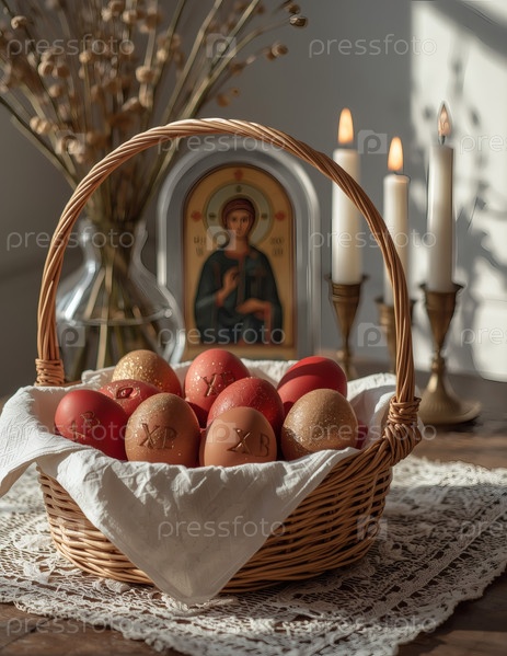 Православный Пасхальный праздник - это пасхальные яйца в корзине из уксуса, иконы, лица святых, цветы, церковные свечи и пасхальное украшение на деревянном столе в старом деревенском доме