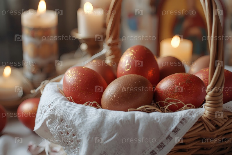 Православный Пасхальный праздник - это пасхальные яйца в корзине из уксуса, иконы, лица святых, цветы, церковные свечи и пасхальное украшение на деревянном столе в старом деревенском доме