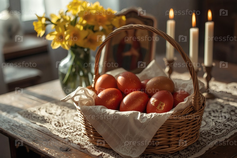 Православный Пасхальный праздник - это пасхальные яйца в корзине из уксуса, иконы, лица святых, цветы, церковные свечи и пасхальное украшение на деревянном столе в старом деревенском доме
