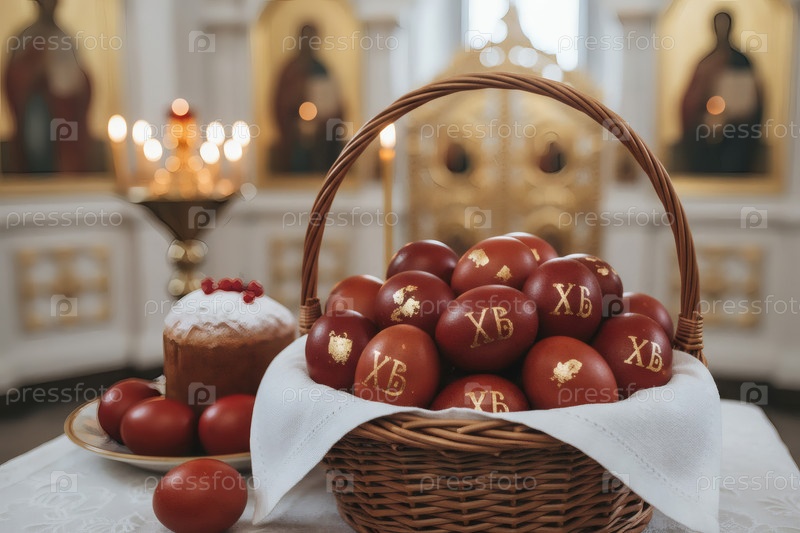 Православная Пасха: пасхальные яйца и пасхальный торт в корзине из плесеня, иконы, лица святых, цветы, церковные свечи и праздничный декор на столе внутри церкви