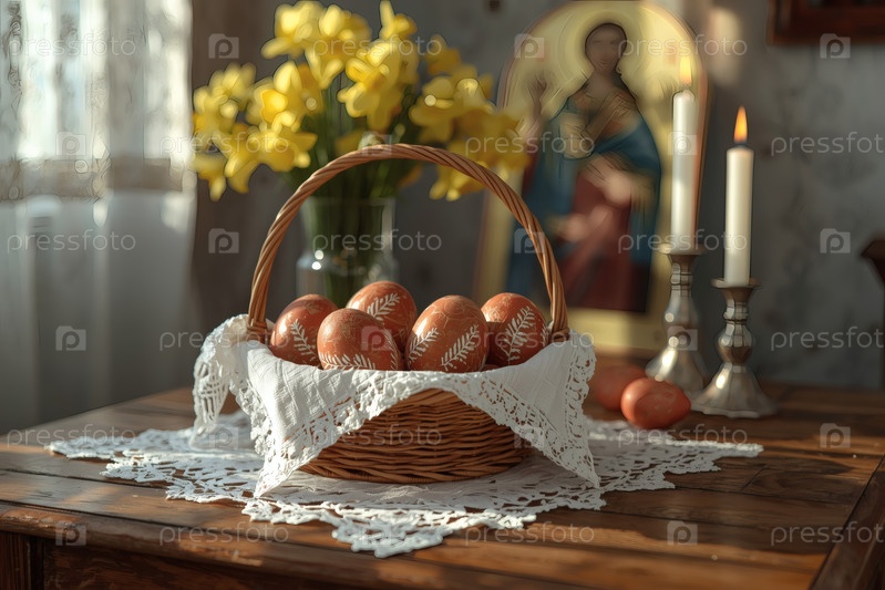 Православный Пасхальный праздник - это пасхальные яйца в корзине из уксуса, иконы, лица святых, цветы, церковные свечи и пасхальное украшение на деревянном столе в старом деревенском доме
