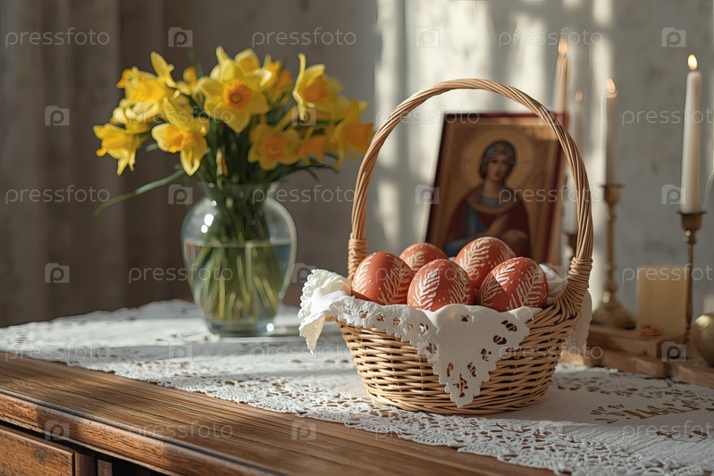 Православный Пасхальный праздник - это пасхальные яйца в корзине из уксуса, иконы, лица святых, цветы, церковные свечи и пасхальное украшение на деревянном столе в старом деревенском доме