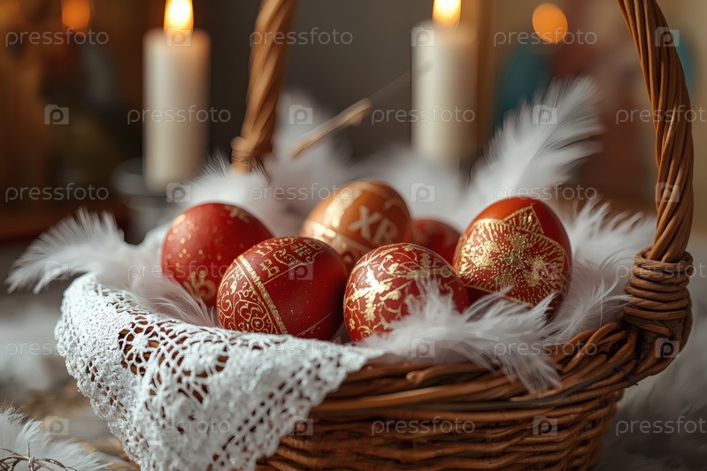 Православный Пасхальный праздник - это пасхальные яйца в корзине из уксуса, иконы, лица святых, цветы, церковные свечи и пасхальное украшение на деревянном столе в старом деревенском доме