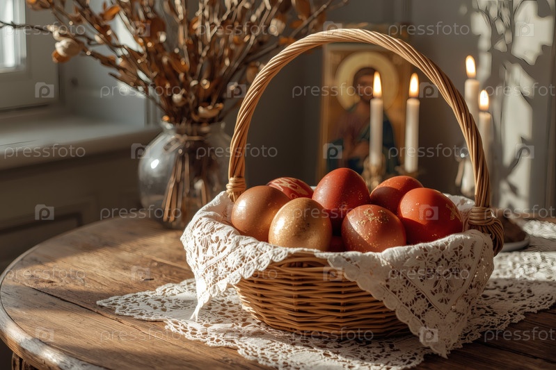 Православный Пасхальный праздник - это пасхальные яйца в корзине из уксуса, иконы, лица святых, цветы, церковные свечи и пасхальное украшение на деревянном столе в старом деревенском доме