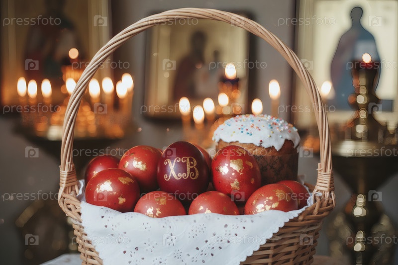 Православная Пасха: пасхальные яйца и пасхальный торт в корзине из плесеня, иконы, лица святых, цветы, церковные свечи и праздничный декор на столе внутри церкви