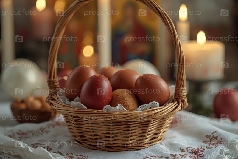 Православный Пасхальный праздник - это пасхальные яйца в корзине из уксуса, иконы, лица святых, цветы, церковные свечи и пасхальное украшение на деревянном столе в старом деревенском доме