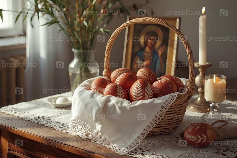 Православный Пасхальный праздник - это пасхальные яйца в корзине из уксуса, иконы, лица святых, цветы, церковные свечи и пасхальное украшение на деревянном столе в старом деревенском доме