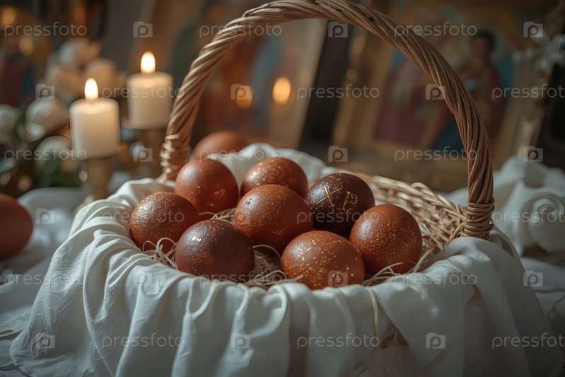 Православный Пасхальный праздник - это пасхальные яйца в корзине из уксуса, иконы, лица святых, цветы, церковные свечи и пасхальное украшение на деревянном столе в старом деревенском доме