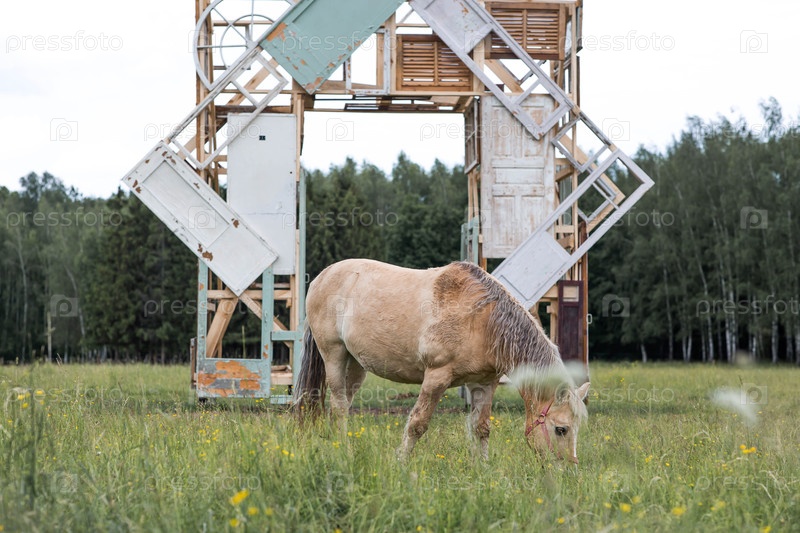 Красивые лошади на пастбище. Лошади в лужайке. Животноводство. Прекрасный природный пейзаж