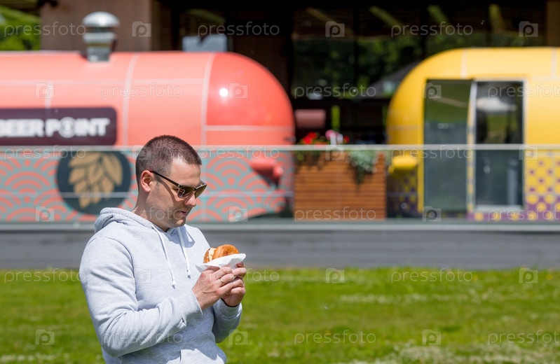 Молодой человек ест вредный вкусный бургер в ресторане быстрого питания на свежем воздухе.Мужчина улыбается и счастлив