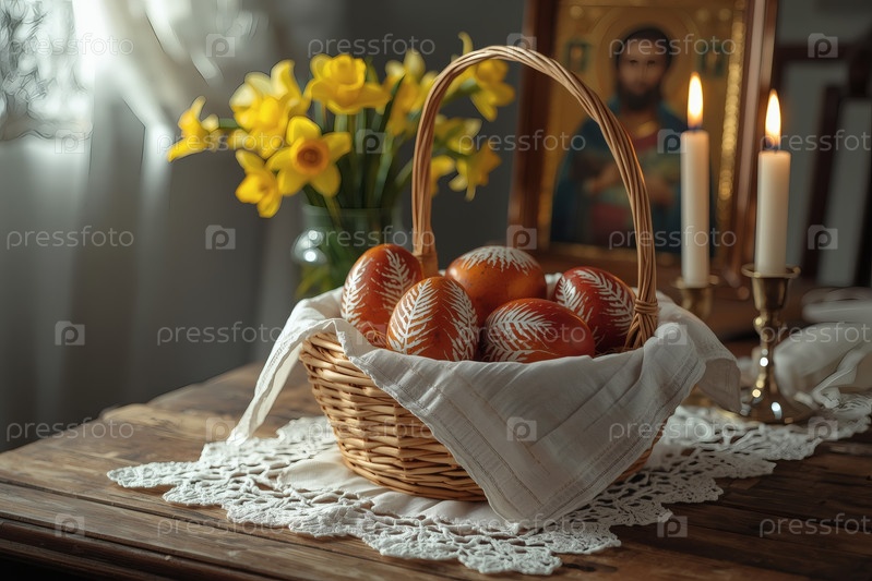 Православный Пасхальный праздник - это пасхальные яйца в корзине из уксуса, иконы, лица святых, цветы, церковные свечи и пасхальное украшение на деревянном столе в старом деревенском доме