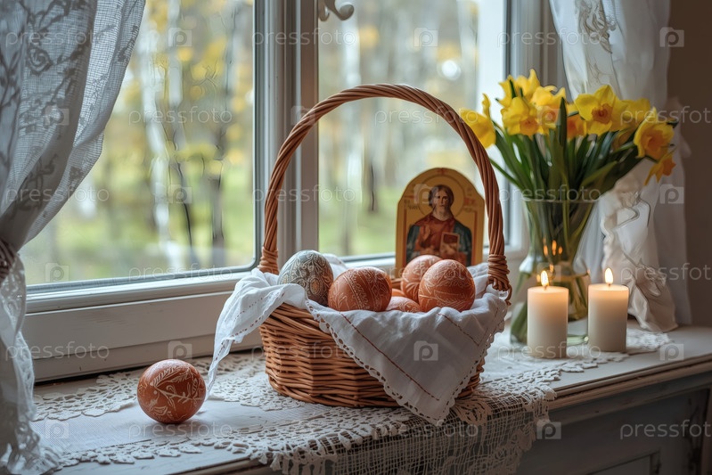 Православный Пасхальный праздник - это пасхальные яйца в корзине из уксуса, иконы, лица святых, цветы, церковные свечи и пасхальное украшение на деревянном столе в старом деревенском доме