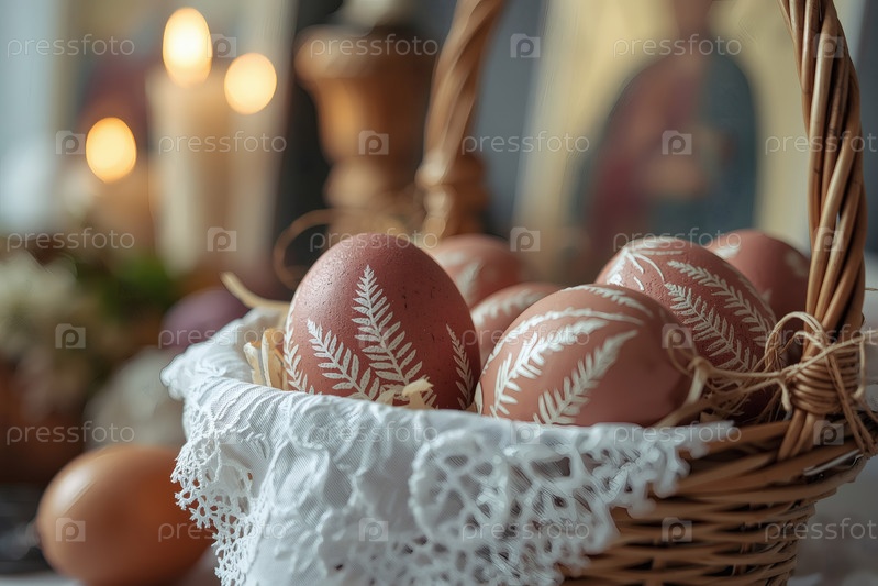 Православный Пасхальный праздник - это пасхальные яйца в корзине из уксуса, иконы, лица святых, цветы, церковные свечи и пасхальное украшение на деревянном столе в старом деревенском доме