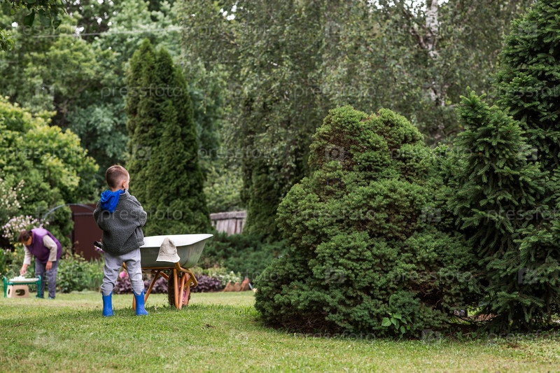 Мальчик с садовым тележком на заднем дворе дома. Концепция огородничества, сельской жизни и обучения ребенка работе. Подготовка и уборка сада. Закрытие летнего сезона